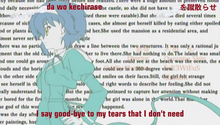 I don't see how a bunch of very simple translations for a few lines of lyrics can be difficult for the masters at Menclave. Man, I don't have a JLPT but I did this in like, 5 minutes, it might not be entirely accurate and such but hell it's better than the shit we've been given. I pity the poor guys who want to learn Japanese by reading this stuff. They'll be spending hours and hours of their lives trying to relate the lyrics from the subs which are never related in the first place -.-;
