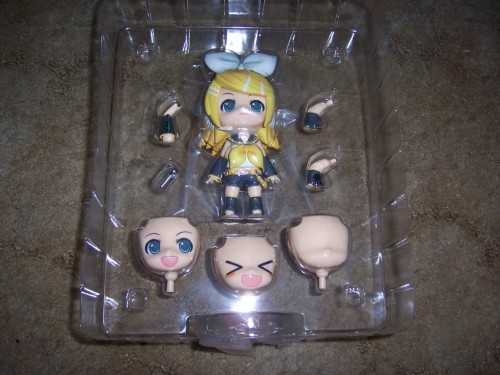 Here is the plastic holder that resides in the box. As you can see its shaped to be able to store Kagamine and all the accessories for her. There are 2 premade faces and some arms and a microphone. It even comes with a blank face for you to draw anything you want if you are so inclined. It comes with a stand too, since the big head makes it difficult for Rin to stand alone.